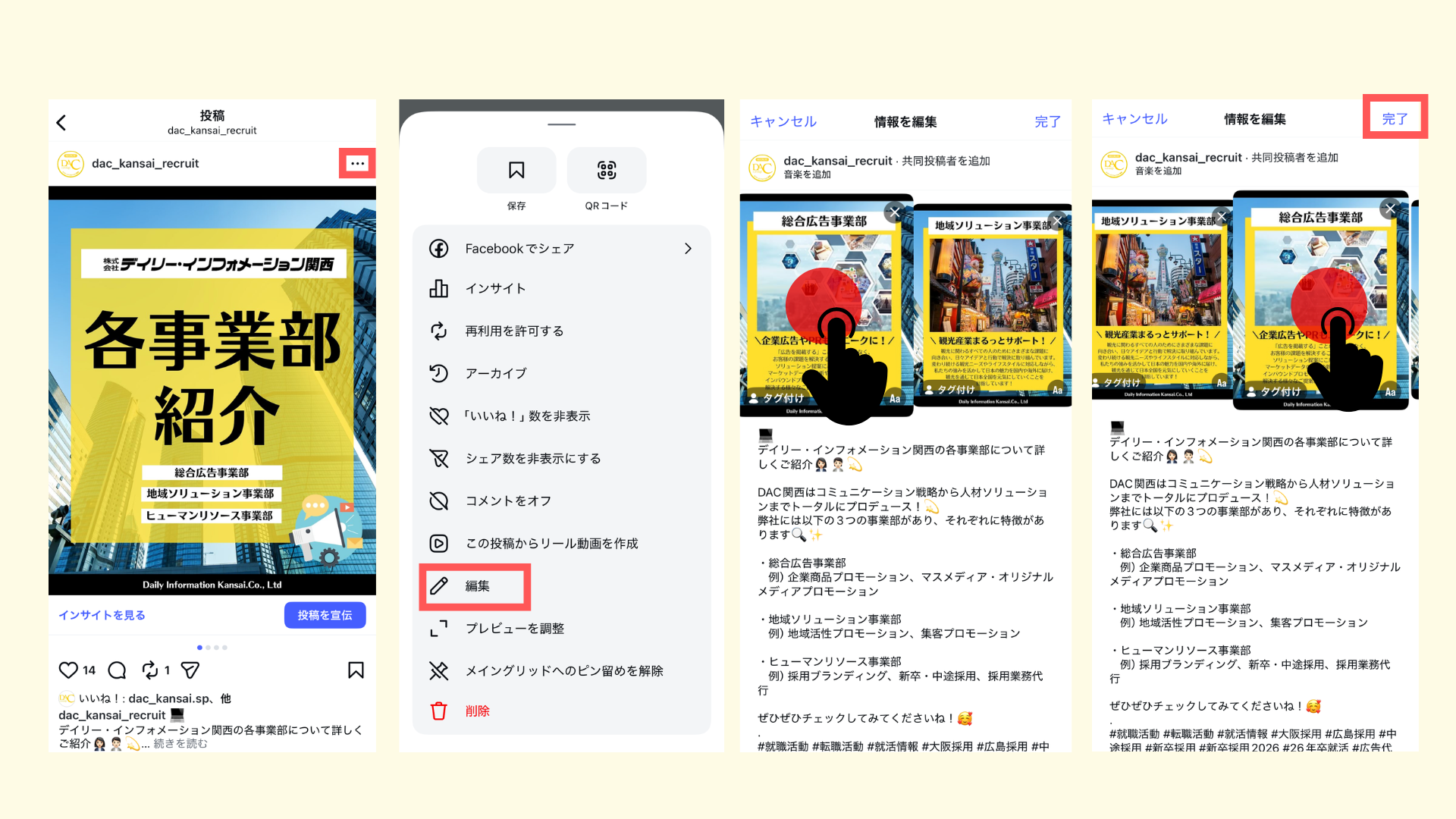 編集画面を開く :順番を変えたい投稿の右上「…」から「編集」をタップ。
