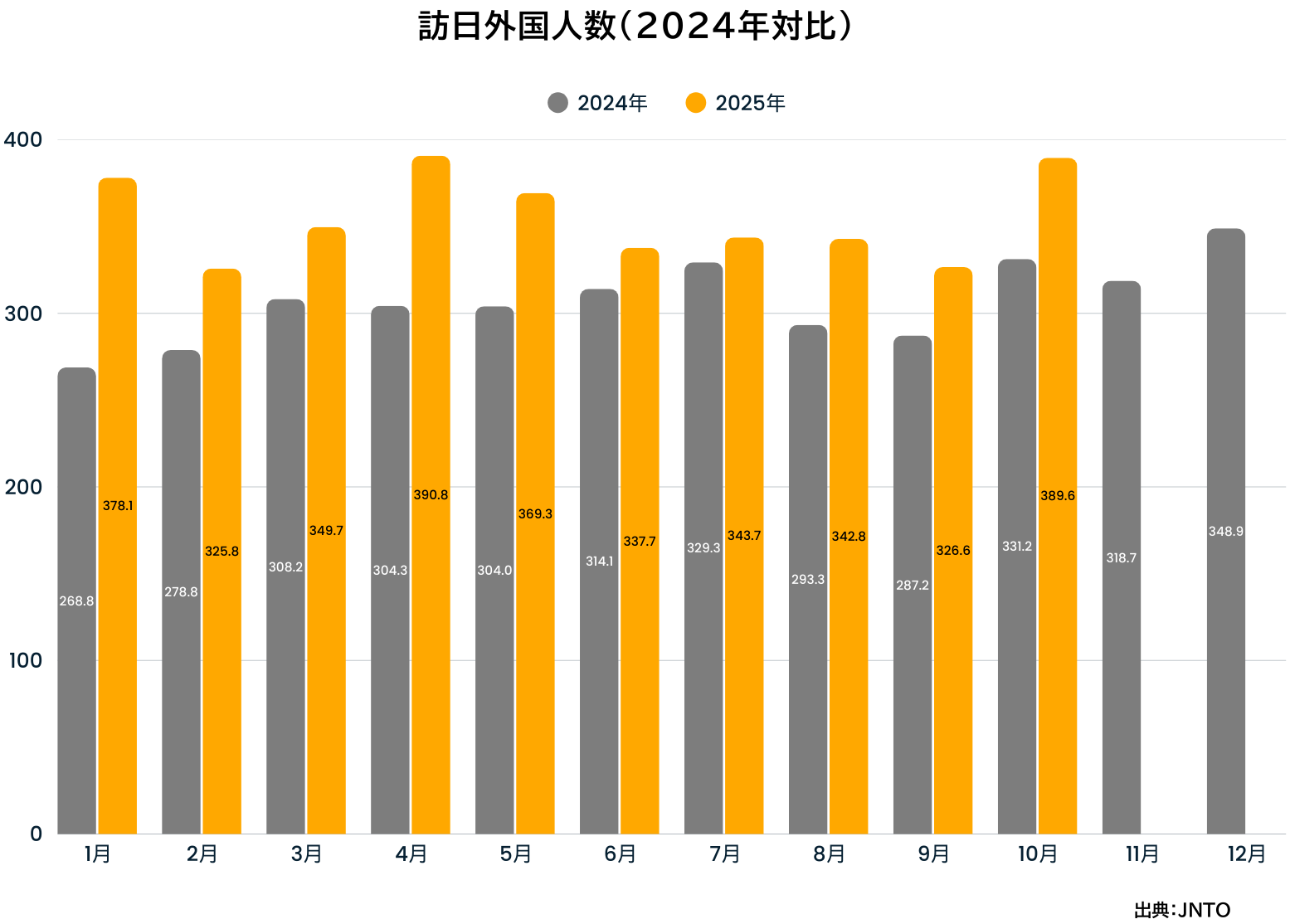 JNTOの発表によると、2025年10月度の訪日外国人数は推計389万6,300人で、前年同月比で17.6%増と大幅な更新なり、10月として過去最高の訪日数を記録しました。
