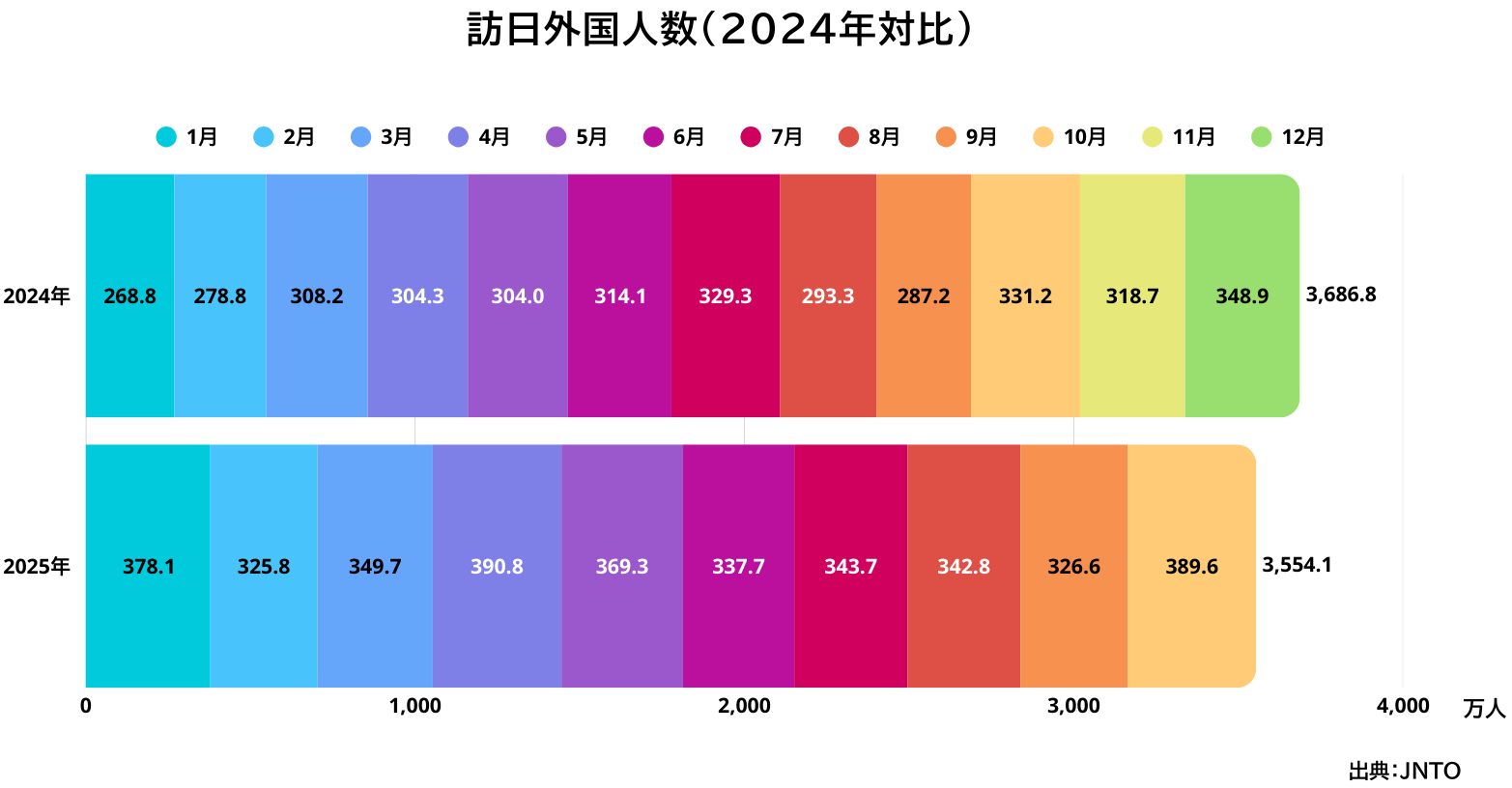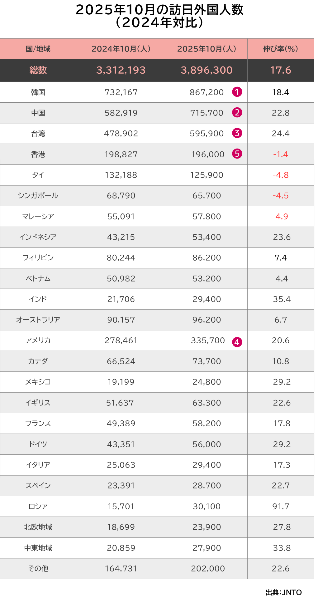 【訪日外国人数】2025年10月の訪日外国人数は3,896,300人で10月として過去最高の訪日数を更新!