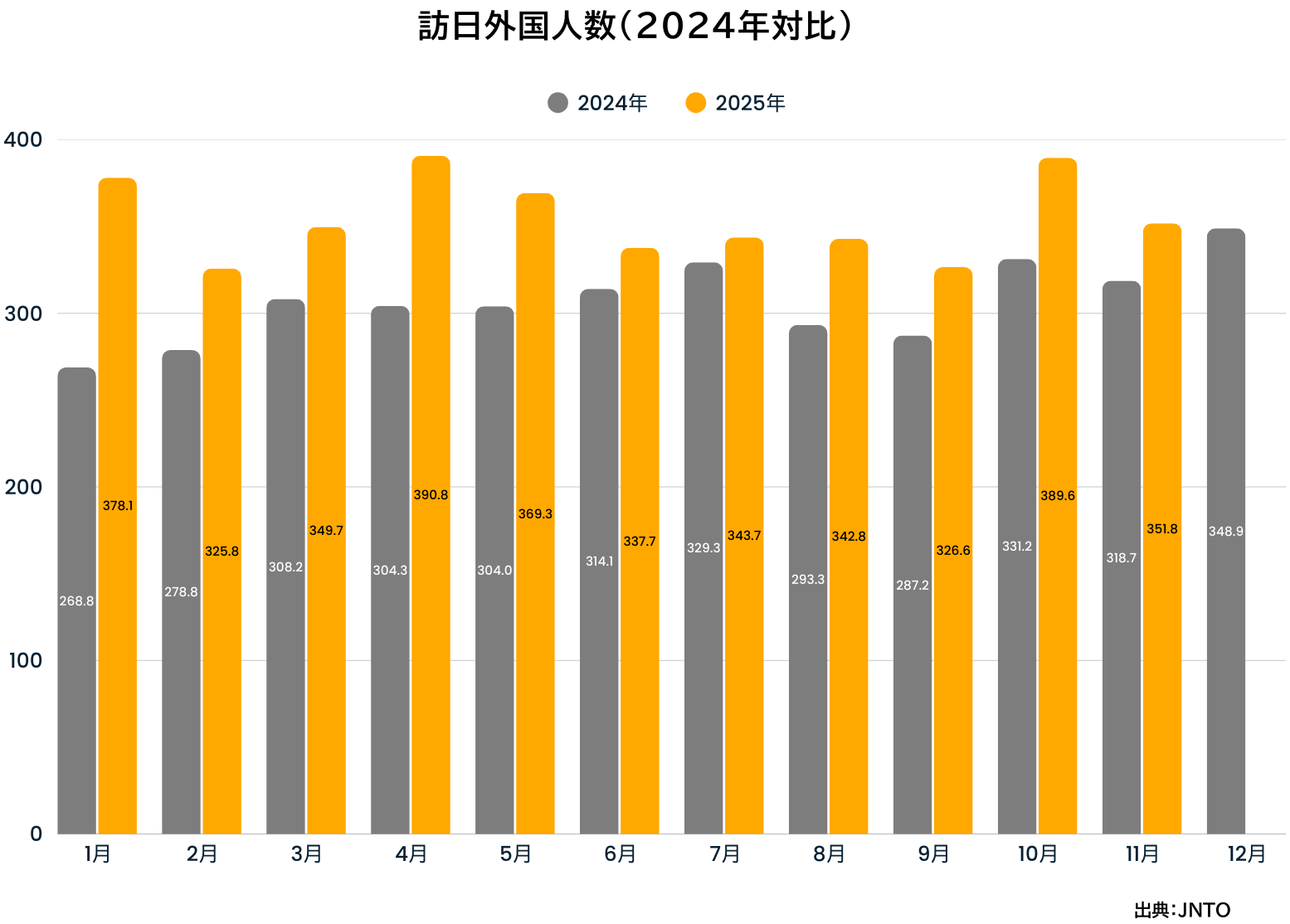 JNTOの発表によると、2025年11月度の訪日外国人数は推計351万8,000人で、前年同月比は10.4%増となりました。さらに2025年1-11月の累計は39,065,600人となり、昨年2024年の1年間の訪日数を現時点で上回っています。