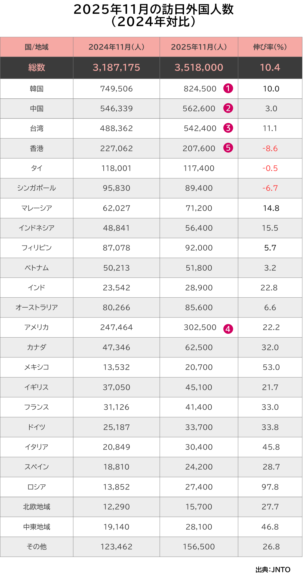 2025年11月で最も多く訪日したのは韓国からの訪日で、82万4500人となっており、続いて中国の56万2600人、台湾からの54万2400人、アメリカから30万2500人、第5位に香港で20万7600人の順となります。