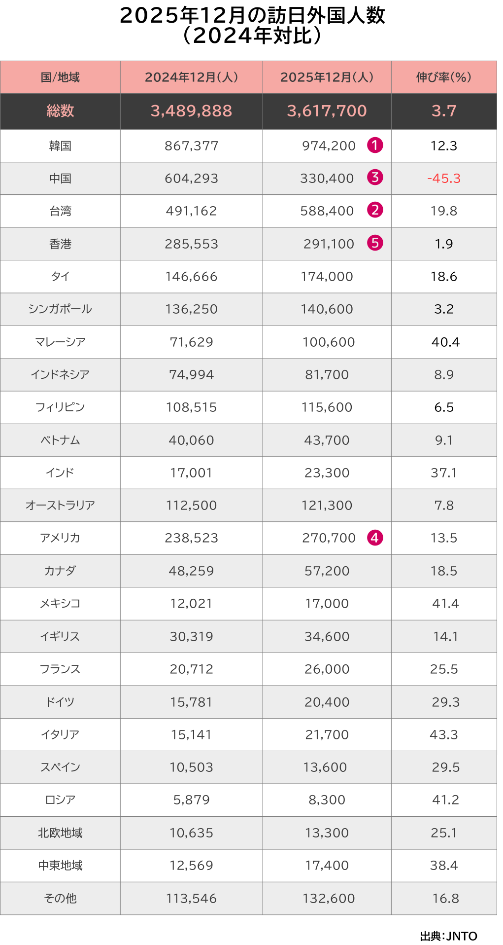 JNTOの発表によると、2025年12月度の訪日外国人数は推計361万7,700人で、前年同月比は3.7%増となりました。