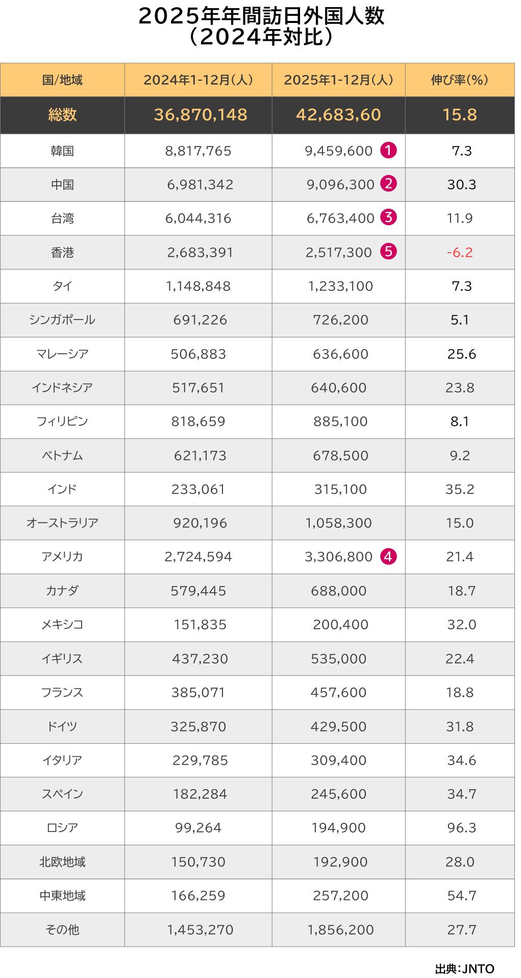 2025年の1年間の訪日数は4268万3,600人となり、過去最高の訪日数を記録しました。年間の伸び率でみると、香港を除くすべての市場で前年より多い訪日となっています。