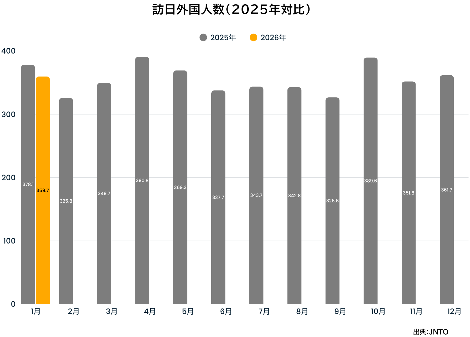 2026年1月の訪日外国人旅行者数は359万7,500人となり、前年同月比で4.9%の減少となりました。前年同月を下回る結果となっています。