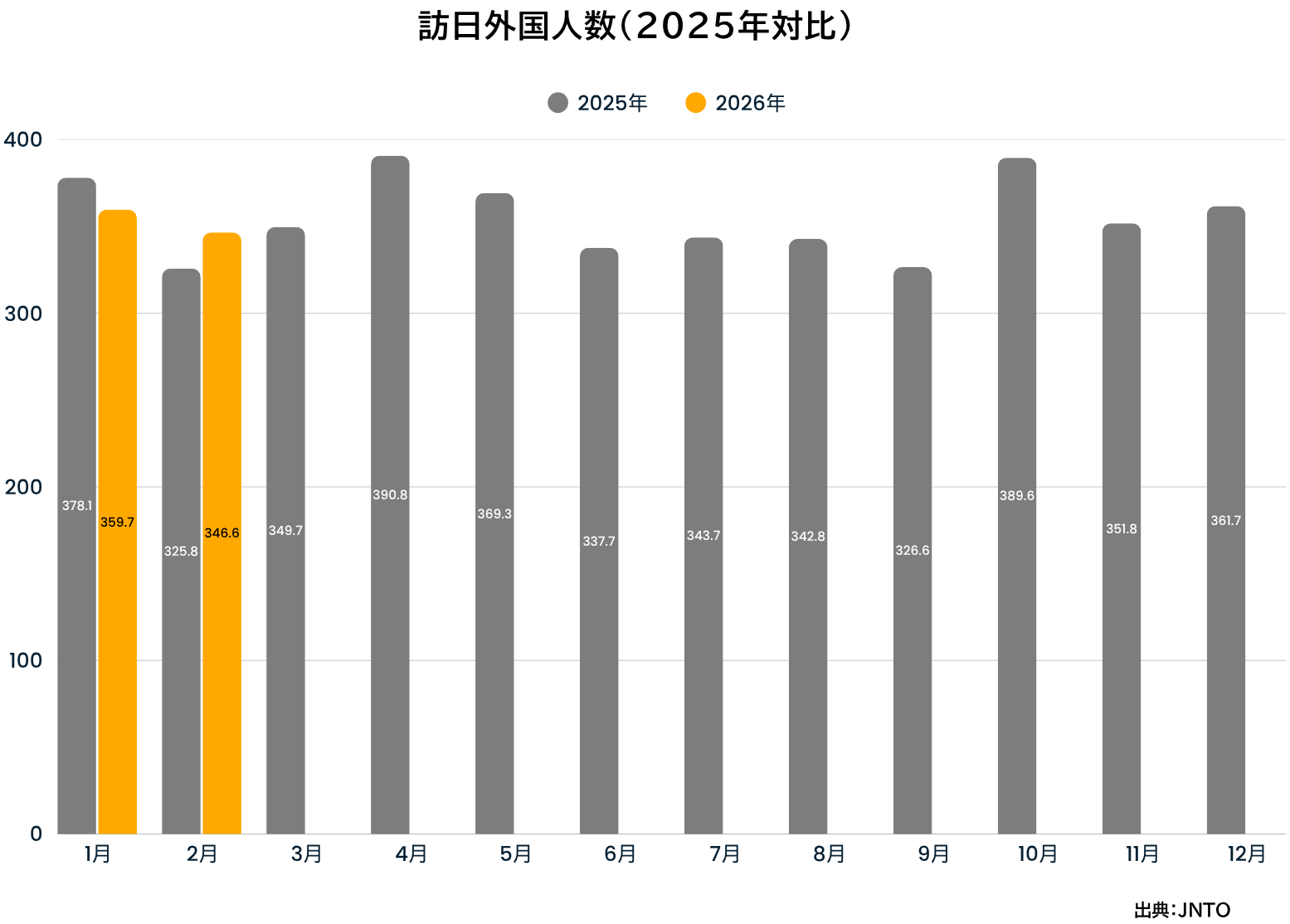 JNTOの発表によると、2026年2月度の訪日外国人数は推計346万6,700人で、前年同月比は6.4%増となりました。2月として過去最高の訪日数を記録しています。