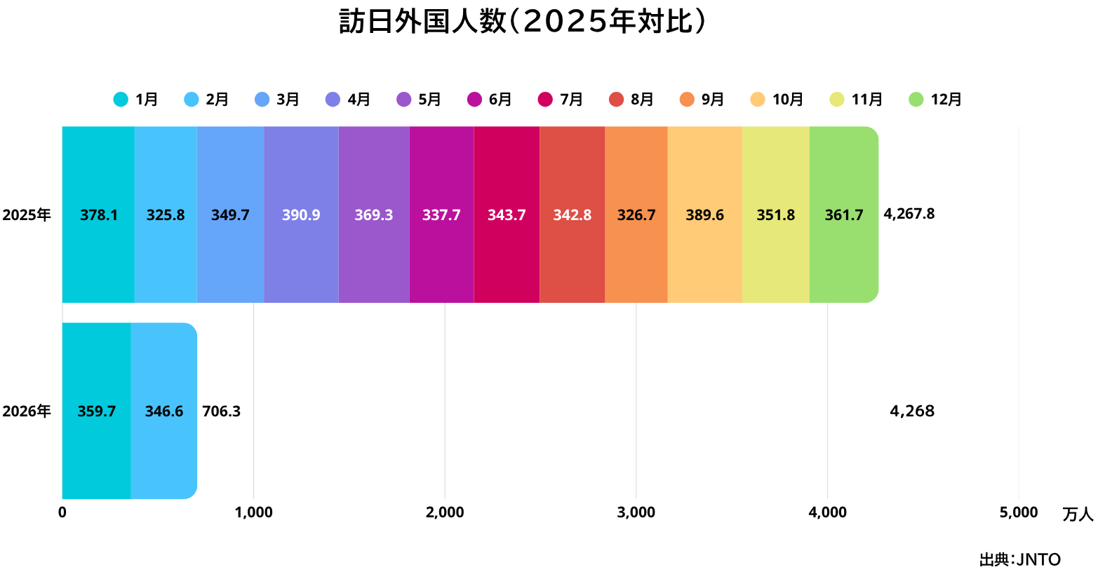 1月は4年ぶりに前年同月比を下回る結果でしたが、2月はプラスに転じています。2026年1~2月の累計では706万4200人で前年同期比0.3%と、ほぼ同程度の数字で推移しています。