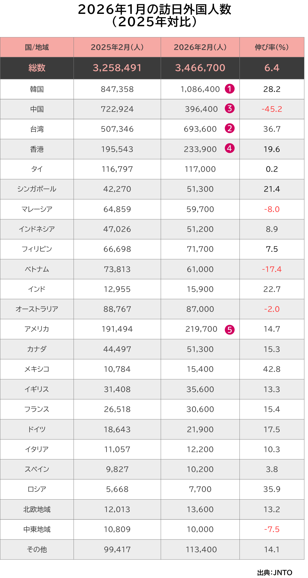 【訪日外国人数】2026年2月の訪日外国人数は3,466,700人、2月として過去最高の訪日数を更新!